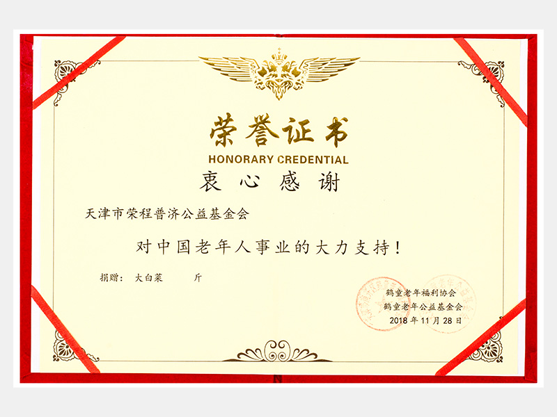 “購滯銷蔬菜捐贈養(yǎng)老院福利院活動”鶴童老年福利協會榮譽證書(慈善)